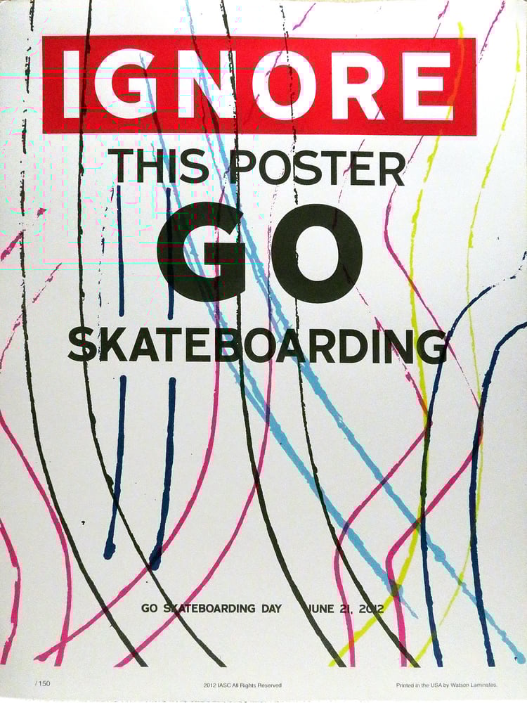 This Go Skateboarding Day poster was designed by Natas Kaupas in 2012. Natas' skateboarding skills have been matched by his work as a designer and artist, and the simple message of this poster is universal.